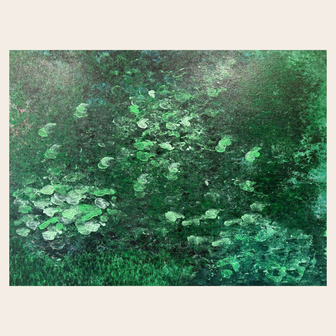 An ode to the quiet, meditative beauty of lakes and delicate lilypads. Layers of deep emerald, jade, and mossy greens create a lush, immersive depth, while soft, pale lilypads float like whispers on the surface, capturing the essence of stillness and reflection.